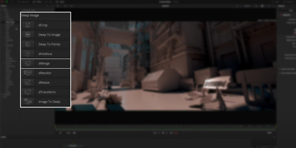 For manipulating deep image data, a new set of nodes, shown in the screenshot above, make it possible to merge, transform, resize, crop, recolor and generate holdouts.