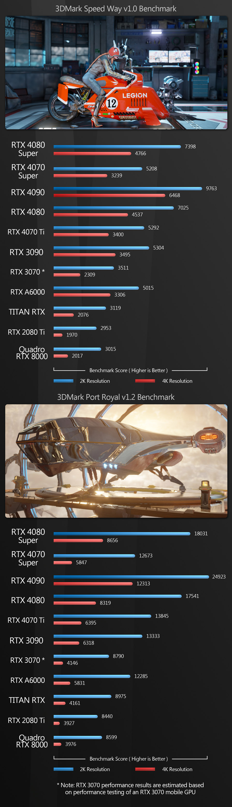 3DMark Speed Way 1.0 and Port Royal 1.2, Cinebench 2024.0.1, CryEngine Neon Noir Ray Tracing Benchmark, OctaneBench 2020.1.5, Redshift Benchmark v3.5, Unity Enemies Demo, V-Ray Benchmark v5.02.01