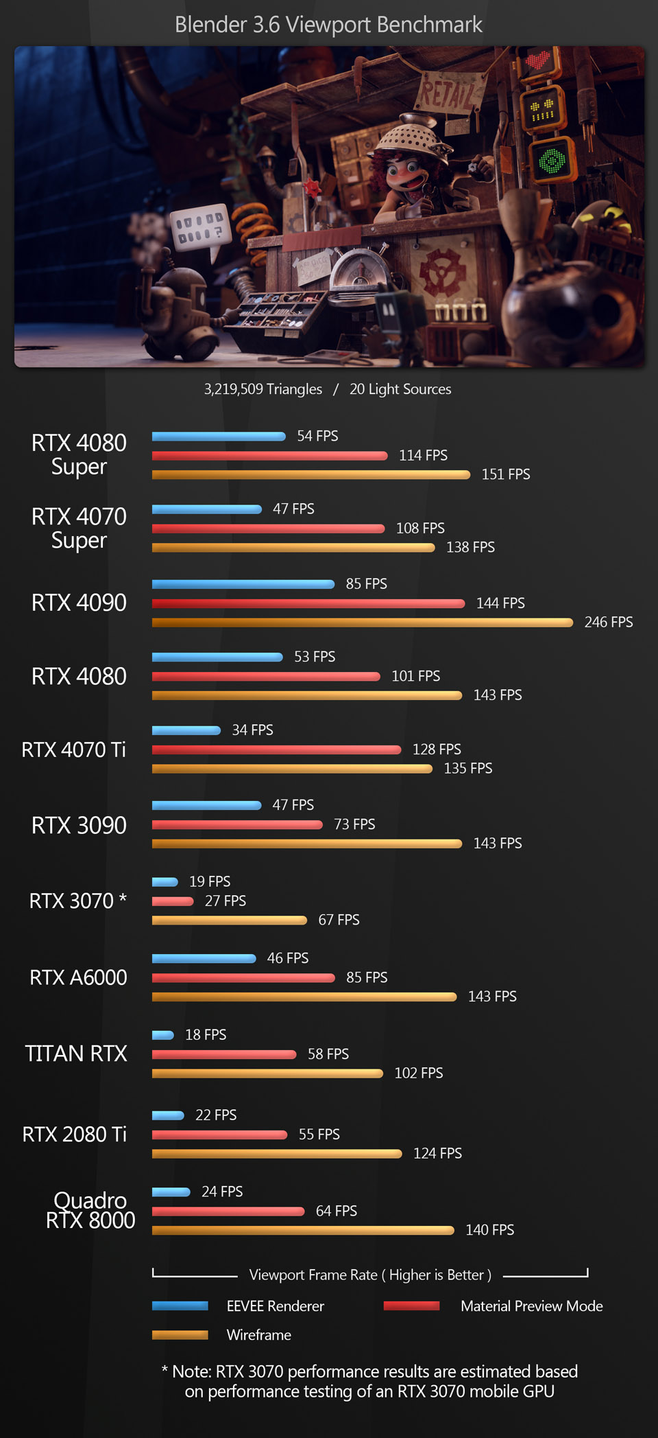 In the viewport and editing benchmarks, the frame rate scores represent the figures attained when manipulating the 3D assets shown, averaged over five testing sessions to eliminate inconsistencies. In all of the rendering benchmarks, the CPU was disabled so only the GPU was used for computing.
