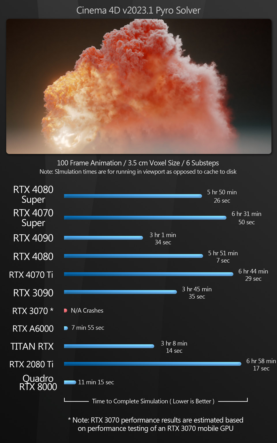 Neither of the new GPUs fares well with the Cinema 4D Pyro simulation, again due to memory constraints. The only GPUs that really perform well are the 48 GB workstation cards.