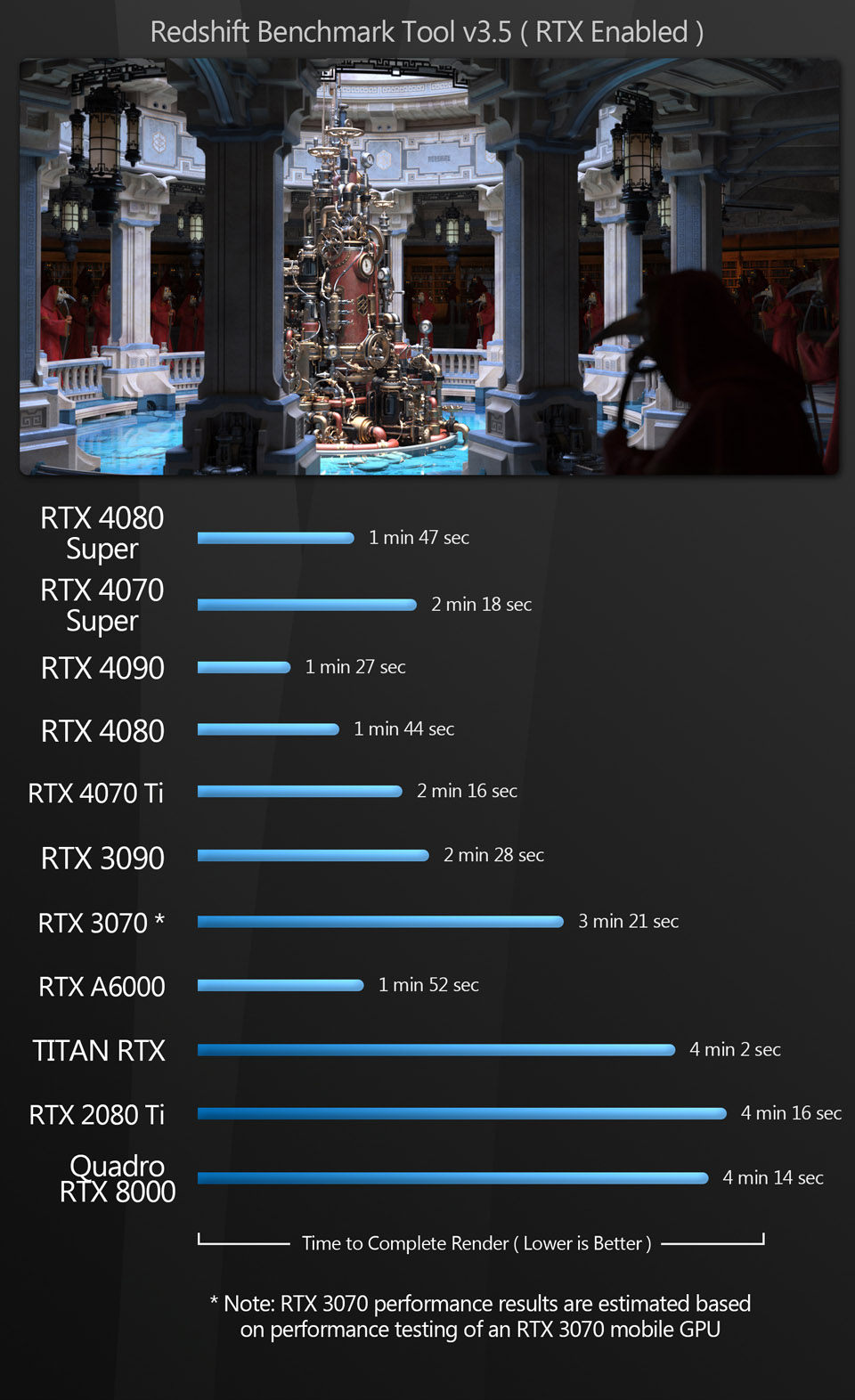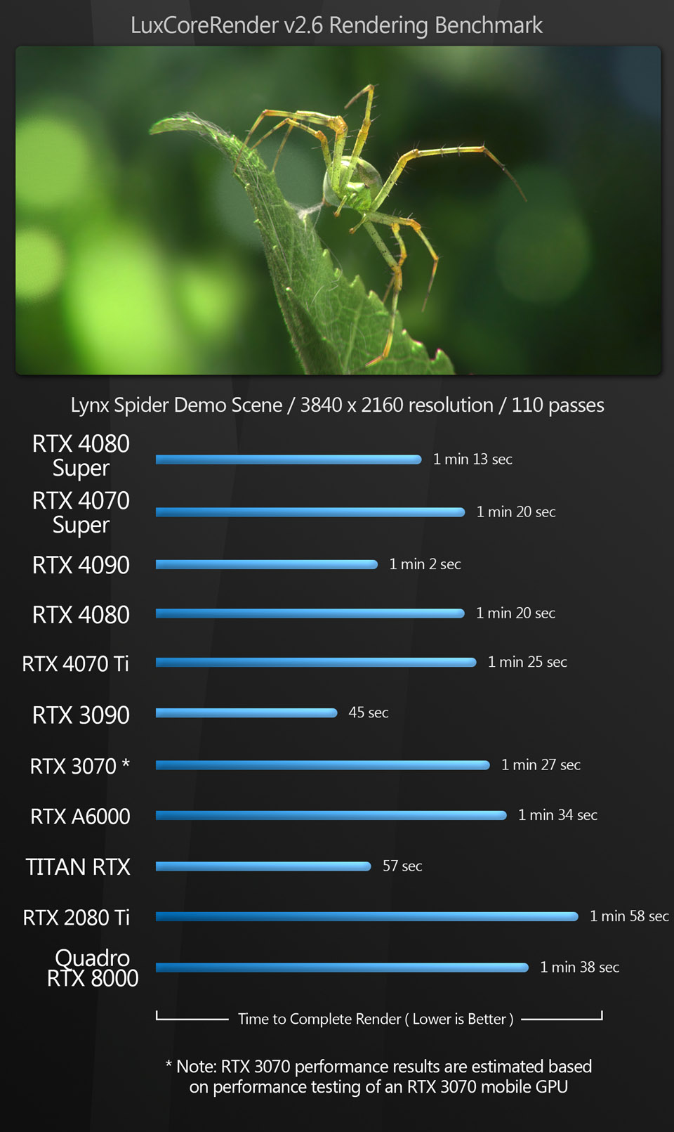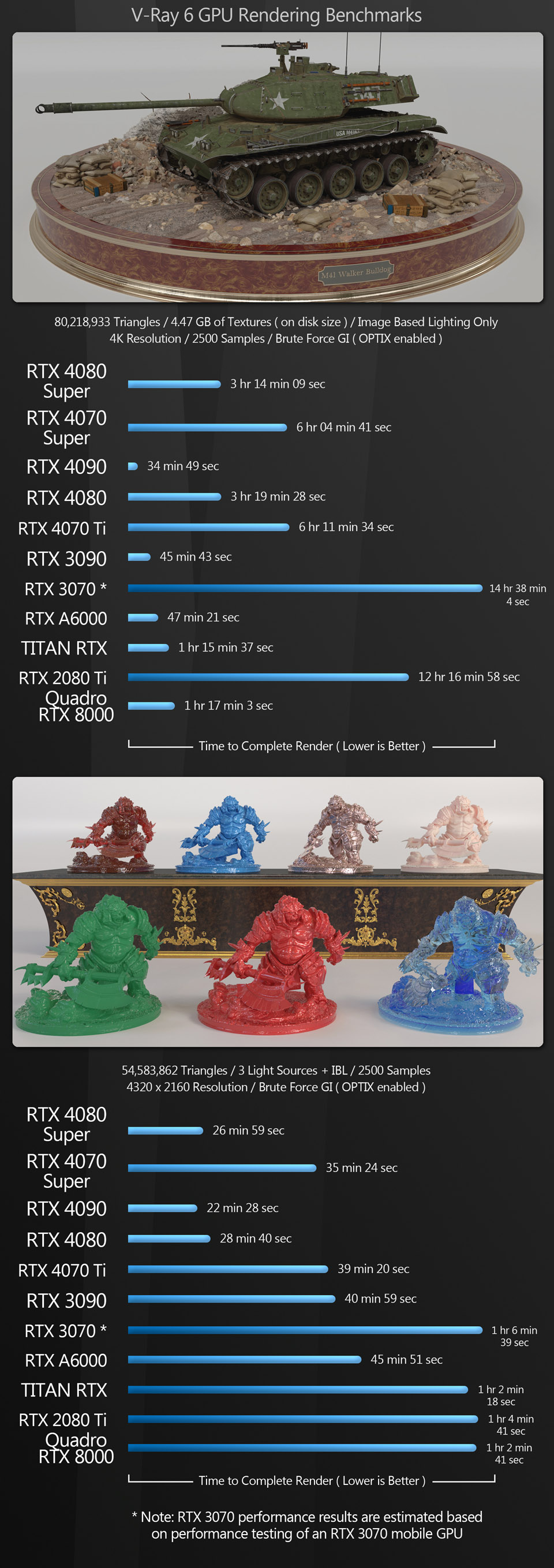 Next, we have a set of GPU rendering benchmarks, performed with an assortment of the more popular GPU renderers, rendering single frames at 4K or higher resolutions.