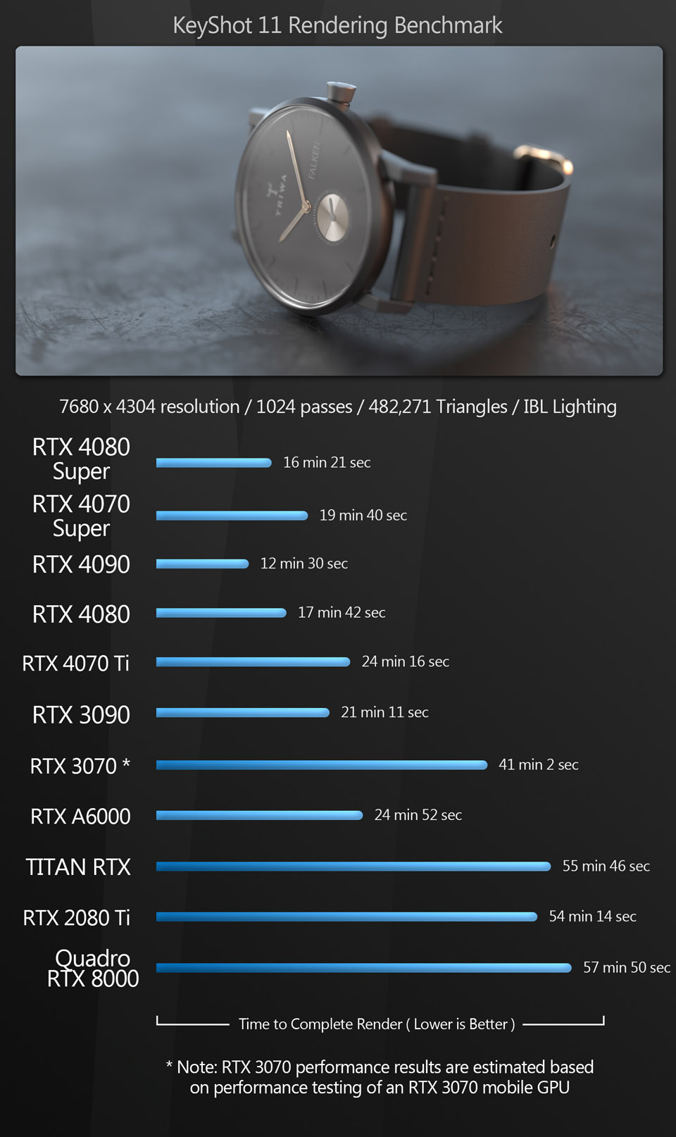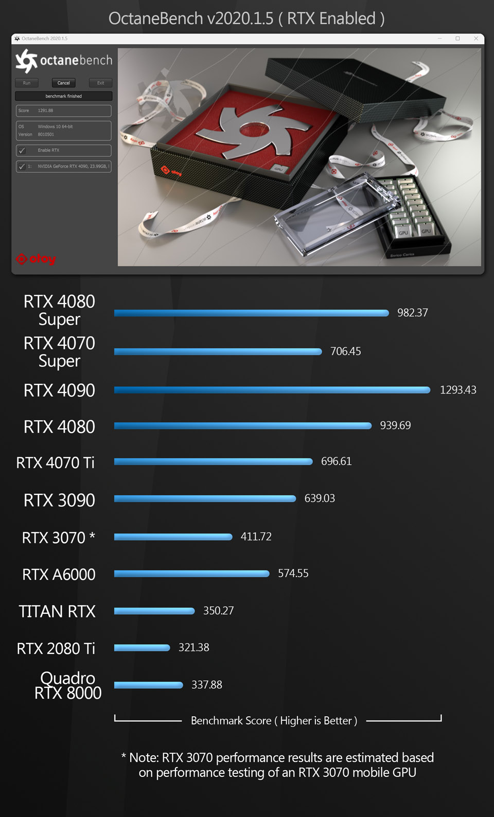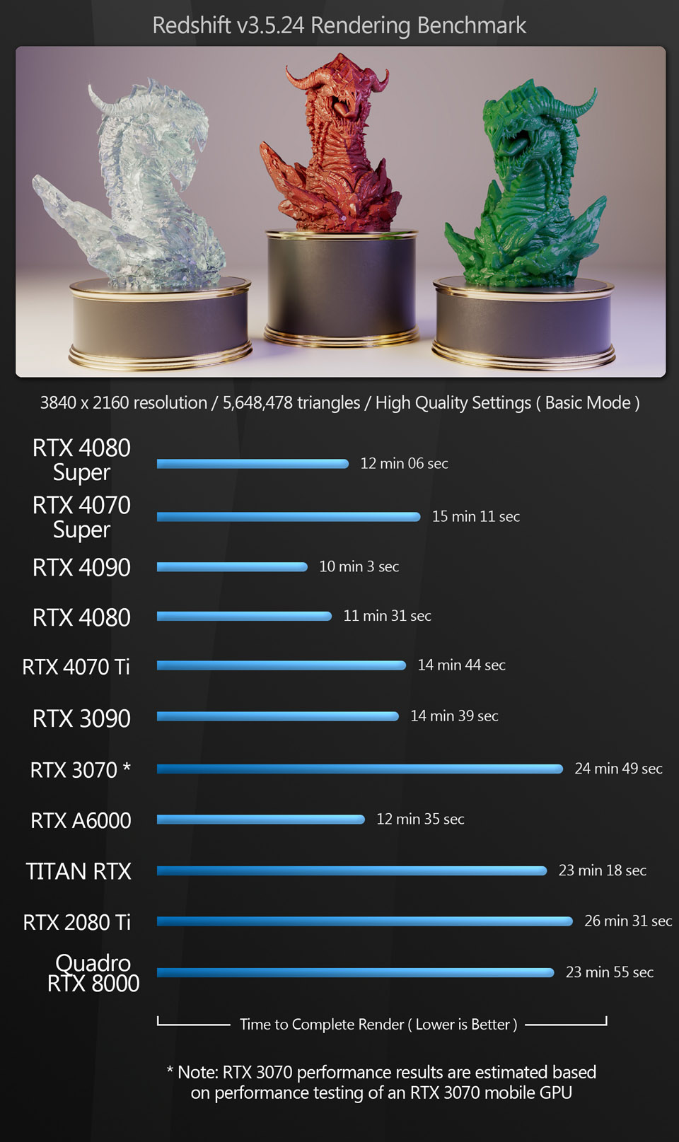 Next, we have a set of GPU rendering benchmarks, performed with an assortment of the more popular GPU renderers, rendering single frames at 4K or higher resolutions.