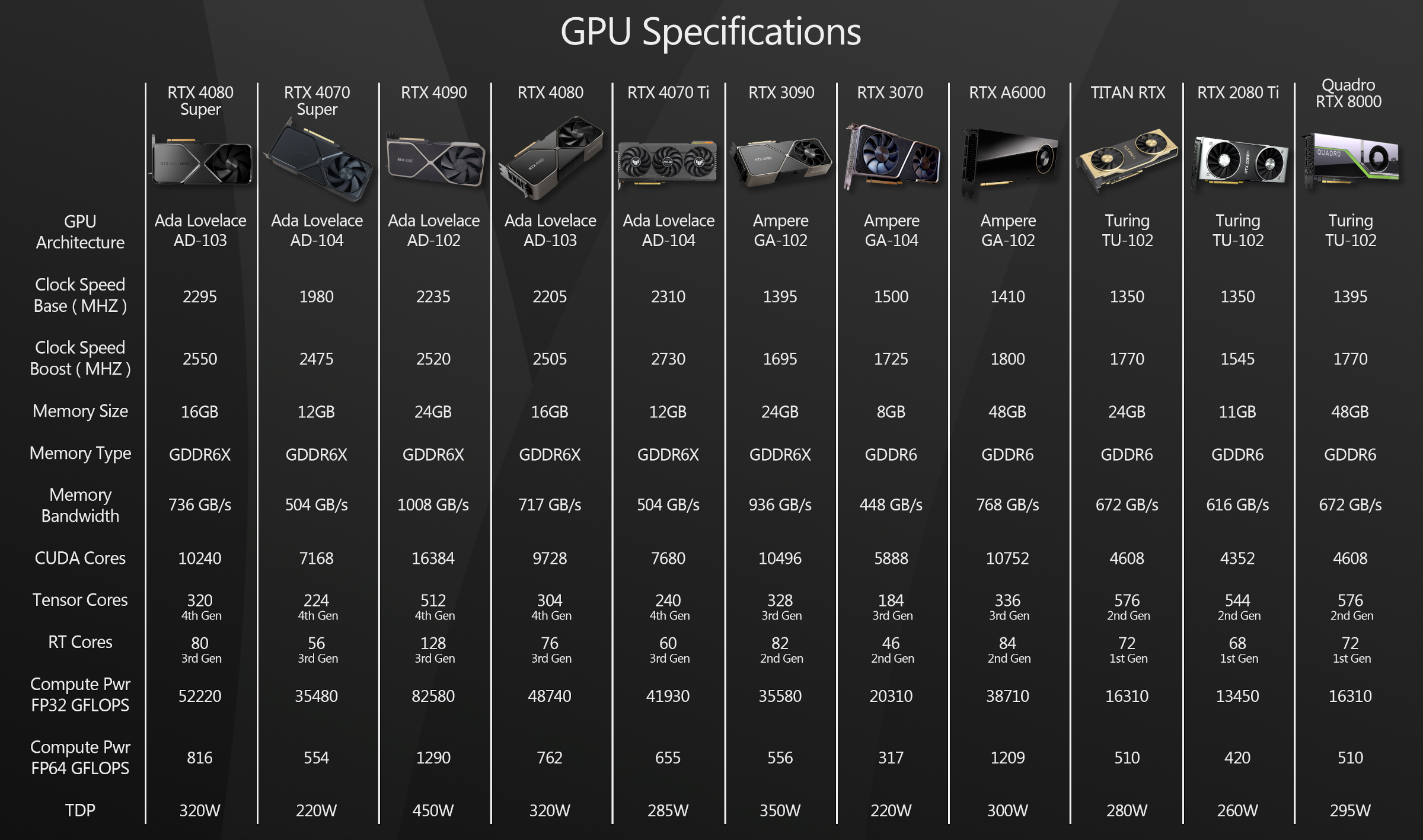 First, let’s run through the specs of the new Super Series GPUs on test. You can find specs for the GeForce RTX 4090, GeForce RTX 4080 and GeForce RTX 4070 TI in the original review.