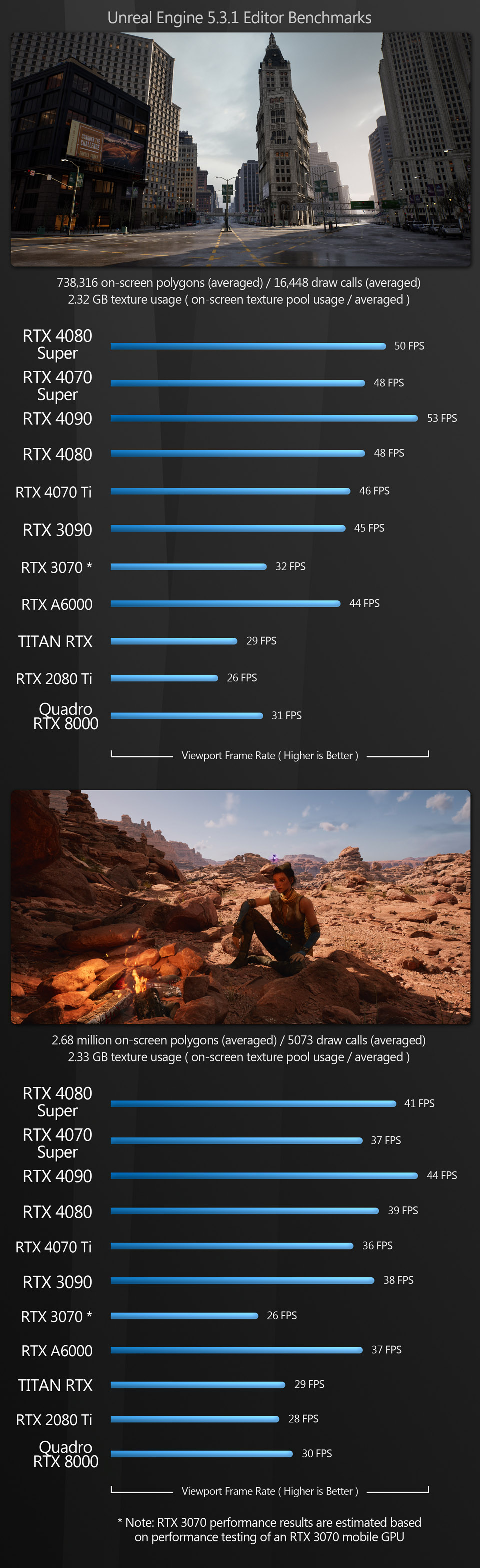 Another thing to note is the Unreal Engine scores. In the original group test, I noted that there was a strange performance anomaly with the City and Valley of the Ancients scenes. This seems to have been a software issue with Unreal Engine 5.1 itself, since moving to Unreal Engine 5.3 has fixed the issue, with the GeForce RTX 40 Series GPUs providing a much larger uplift in performance over the the older cards.
