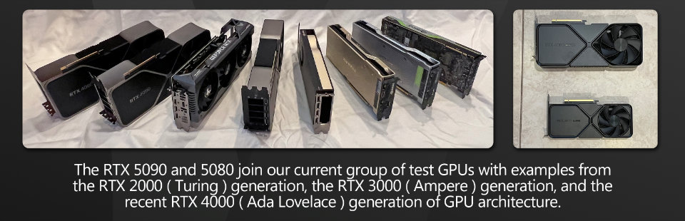 I tested the GeForce RTX 5090 and 5080 against all of the GPUs from my previous group test, which includes many of the Ada Lovelace GeForce RTX 40 Series GPUs, several Ampere GeForce RTX 30 Series and Turing GeForce RTX 20 Series GPUs, plus a couple of older workstation cards. You can see the full lineup in the specs table above.