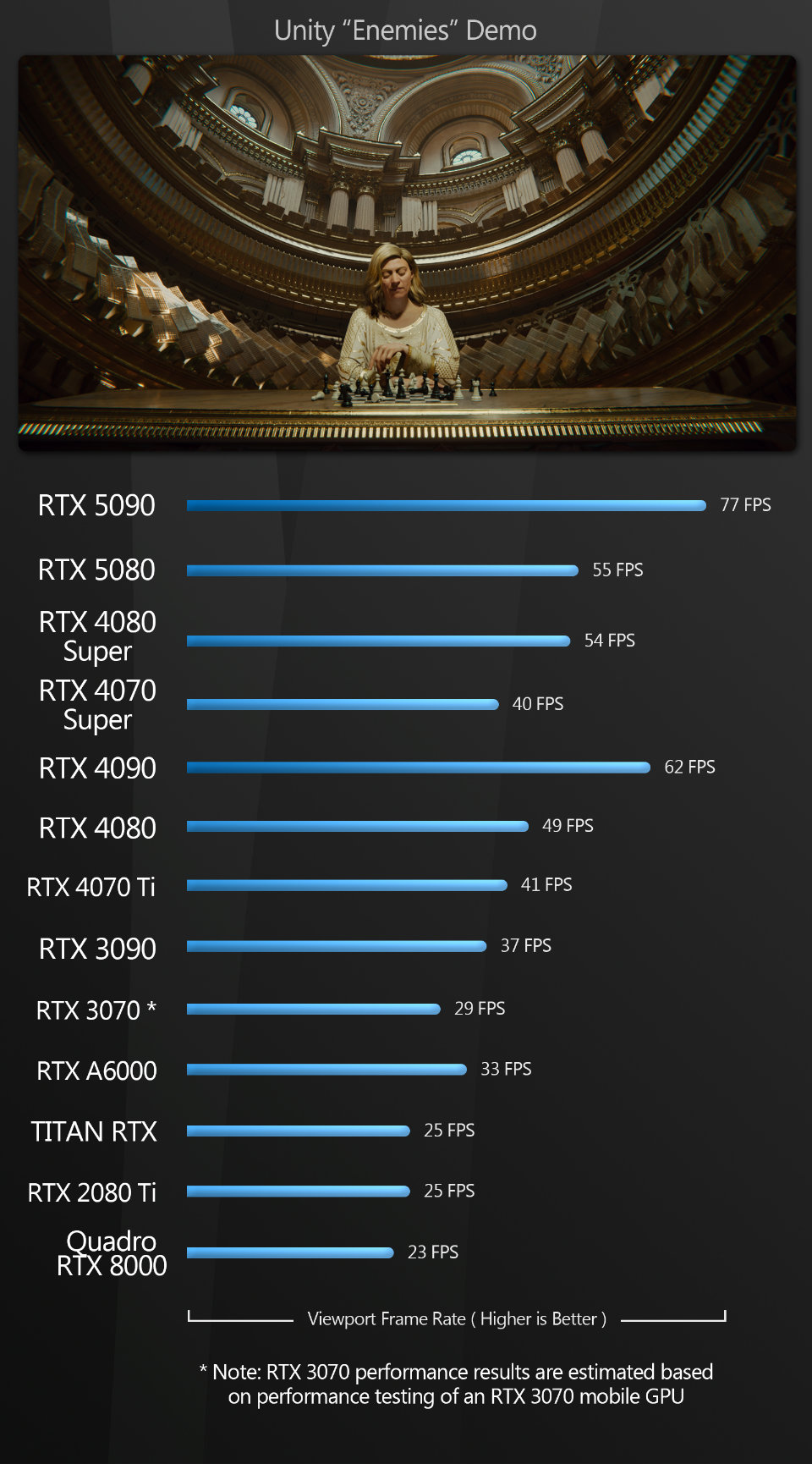 Unity Unity follows the same pattern as Fusion: the GeForce RTX 5090 takes first place, followed by the 5080, and all the previous-generation GPUs come in behind.
