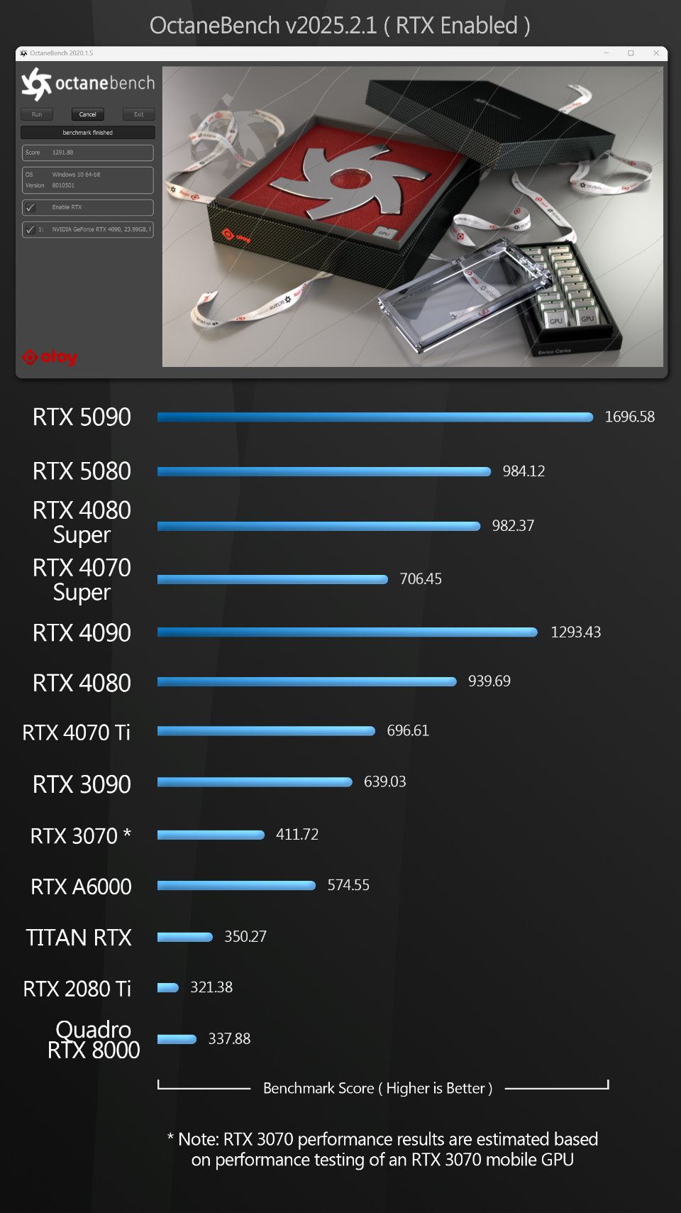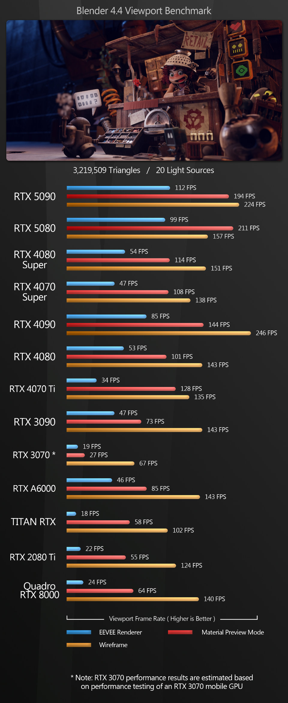 Blender Blender is the first test where the new Blackwell GPUs really shine across the different view modes. The GeForce RTX 5090 takes the top spot with the Eevee renderer by a very large margin, losing out only to the GeForce RTX 4090 in wireframe mode.