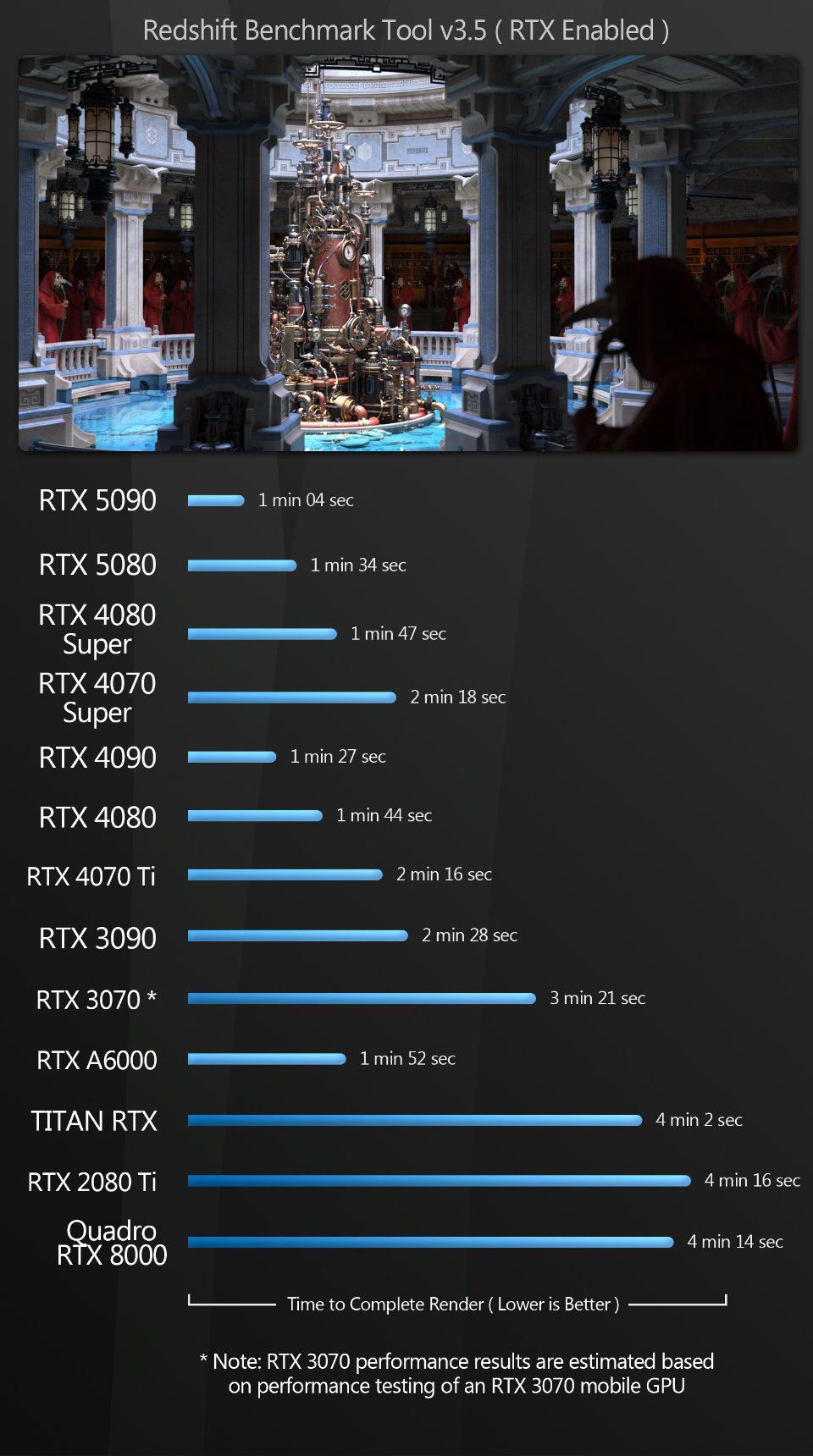 Next, we have a set of GPU rendering benchmarks, performed with an assortment of the more popular GPU renderers, rendering single frames at 4K or higher resolutions.