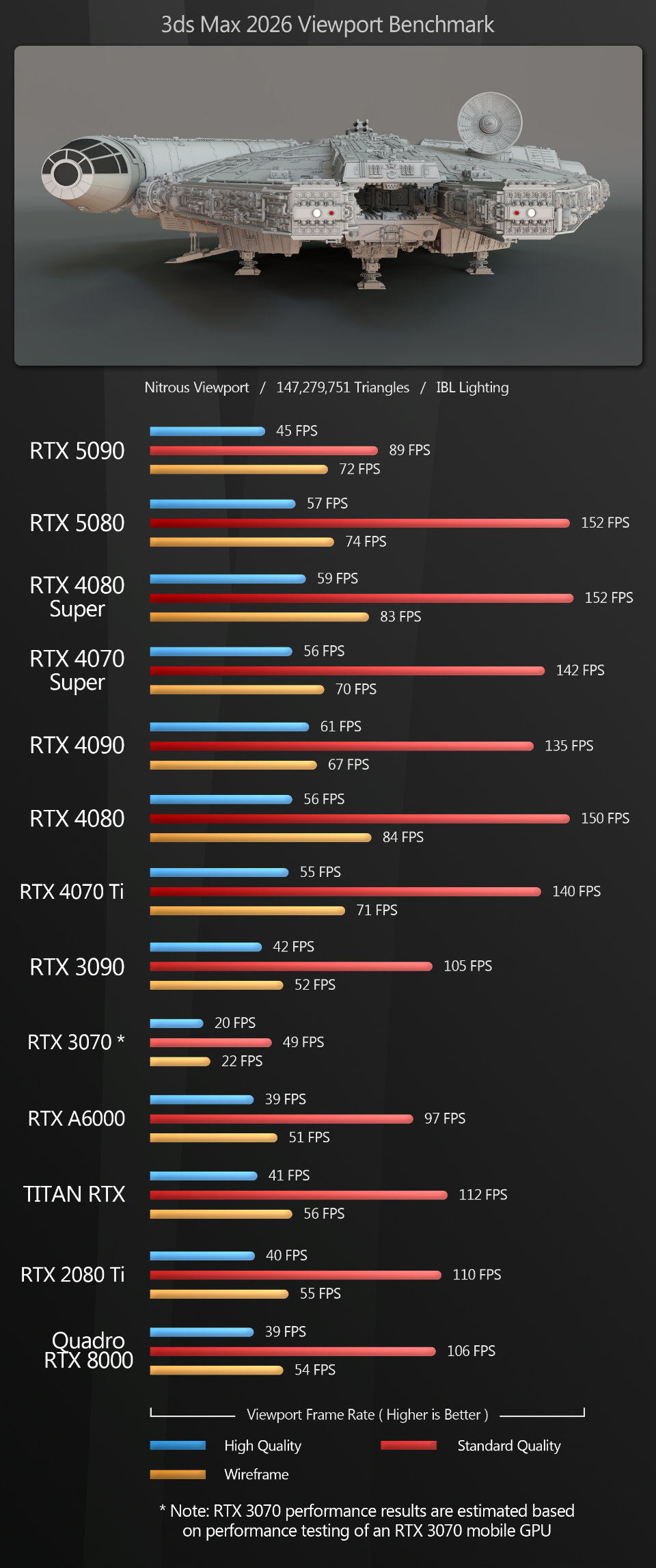 3ds Max The surprise here is the GeForce RTX 5090’s poor performance relative to the previous-generation Ada Lovelace GPUs, with viewport frame rates below those of the GeForce RTX 4070 Ti. The extra GPU memory alone should have given it a performance boost in this heavy scene, even over the 24 GB GeForce RTX 4090, but instead, we see the reverse.