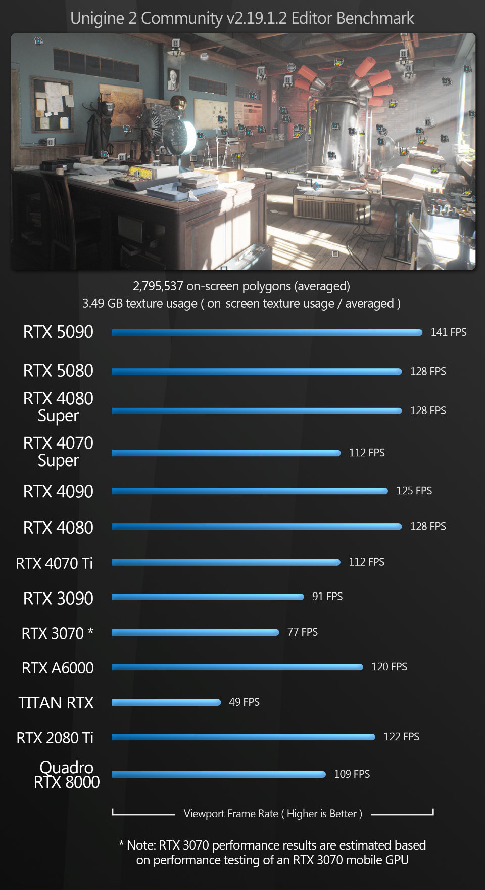 Unigine With Unigine, once again, the GeForce RTX 5090 takes the top spot. The 5080 ties with the 4080 Super and the 4080 for second place.