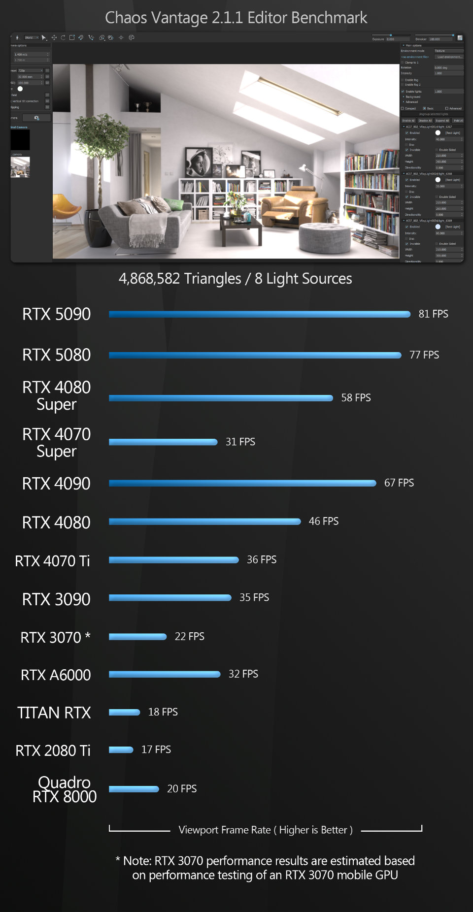 Chaos Vantage Vantage follows a similar pattern to Unigine, Unity and Unreal Engine. Both the GeForce RTX 5090 and the 5080 take a commanding lead over all the previous-gen GPUs.