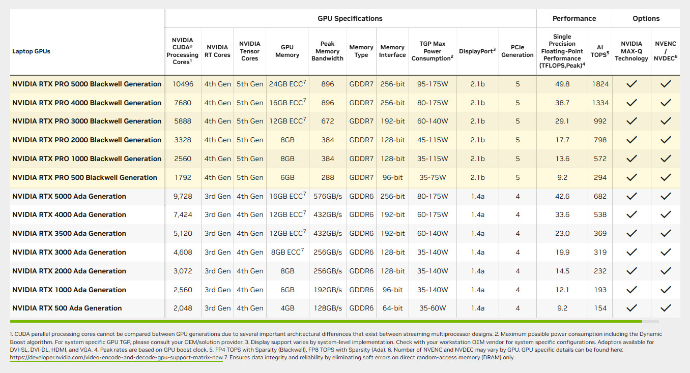 NVIDIA’s spec chart for the RTX PRO Blackwell laptop GPUs. Click the image to view it full-size.