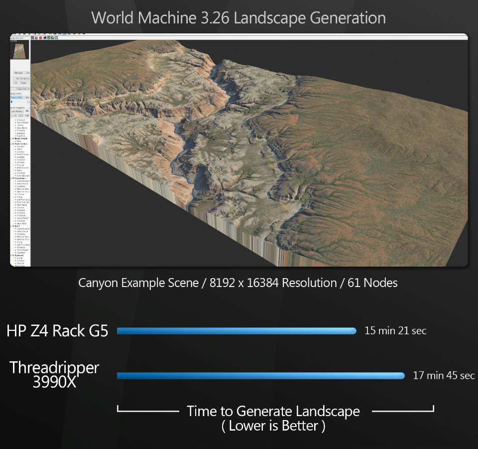 The fact that the Threadripper system wins in the Houdini fluid simulation is no surprise: Houdini’s FLIP solver is fully multi-threaded, so despite the age difference, you would expect its 64-core CPU to beat the 16-core CPU in the Z4 Rack G5. But with World Machine, also multi-threaded, the Z4 Rack G5 takes a decent lead over the Threadripper system.