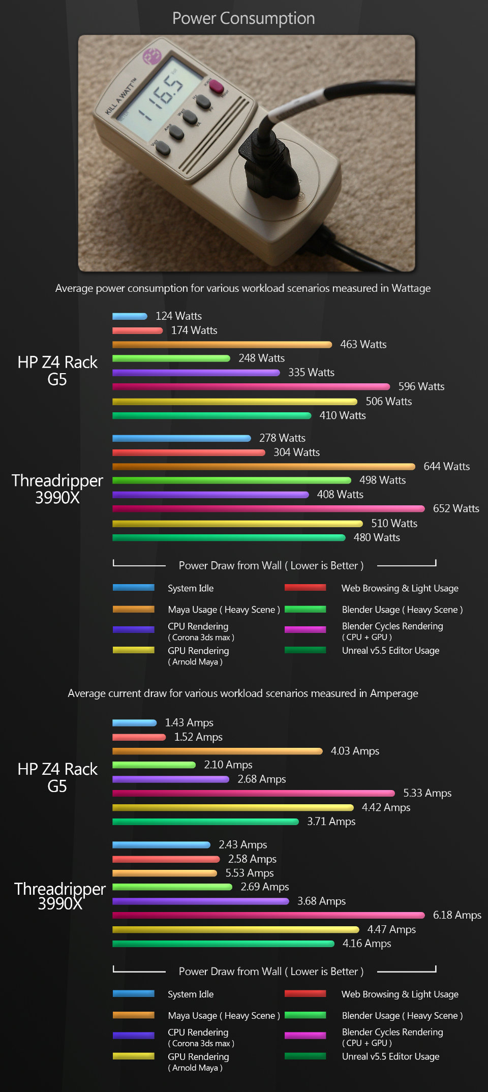 As you can see, the Z4 Rack G5 uses substantially less power than the Threadripper system, as is to be expected of a machine with a quarter of the CPU cores and a slightly less power-hungry GPU. But all in all, these are pretty decent numbers.