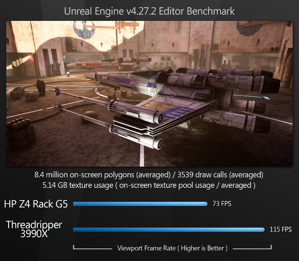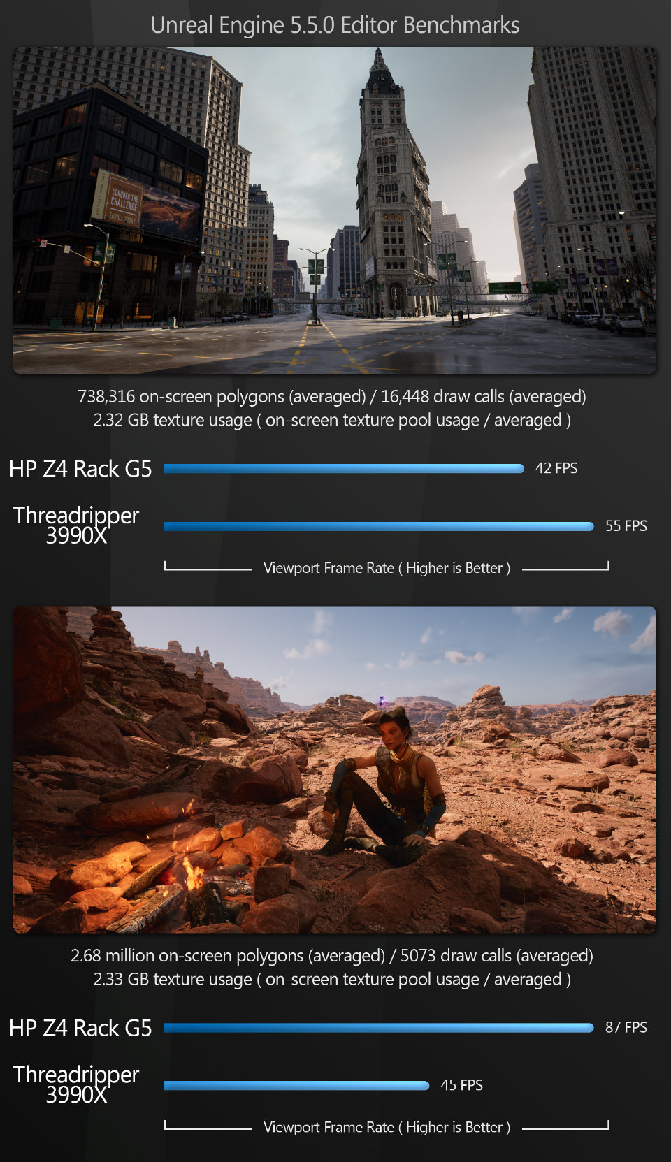 As a games card, the GeForce RTX 4090 in the Threadripper system may be a better fit for the Unreal Editor, but if that were the only factor, the Z4 Rack G5, with its RTX 6000 Ada Generation GPU, would not have won the Valley of the Ancients test, let alone by such a large margin. For all of its advanced features, since version 5.0, Unreal Engine has exhibited some inconsistent and unpredictable behavior when it comes to performance across different hardware.