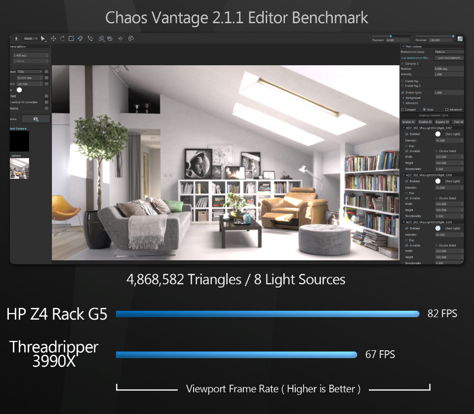 With the Chaos Vantage Scene, the Z4 Rack takes a commanding lead over the Threadripper system. Again, the CPU is the deciding factor: the test scene fits inside the 24GB frame buffer on the Threadripper system’s GeForce RTX 4090, so GPU memory is not an issue.