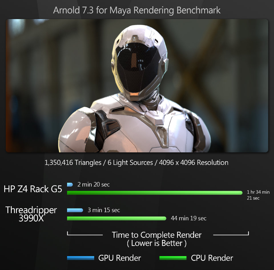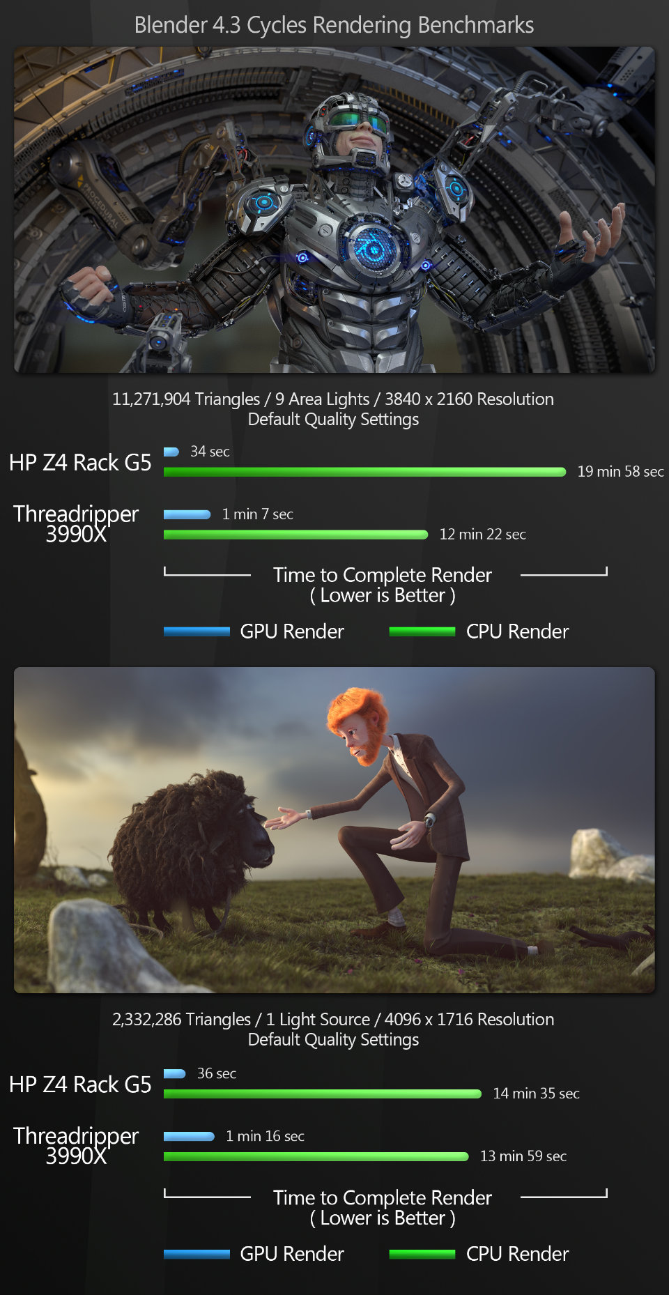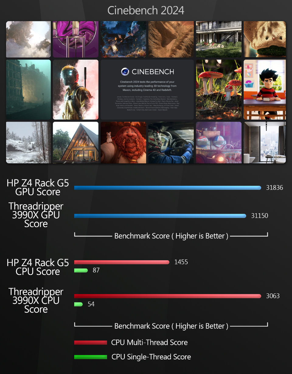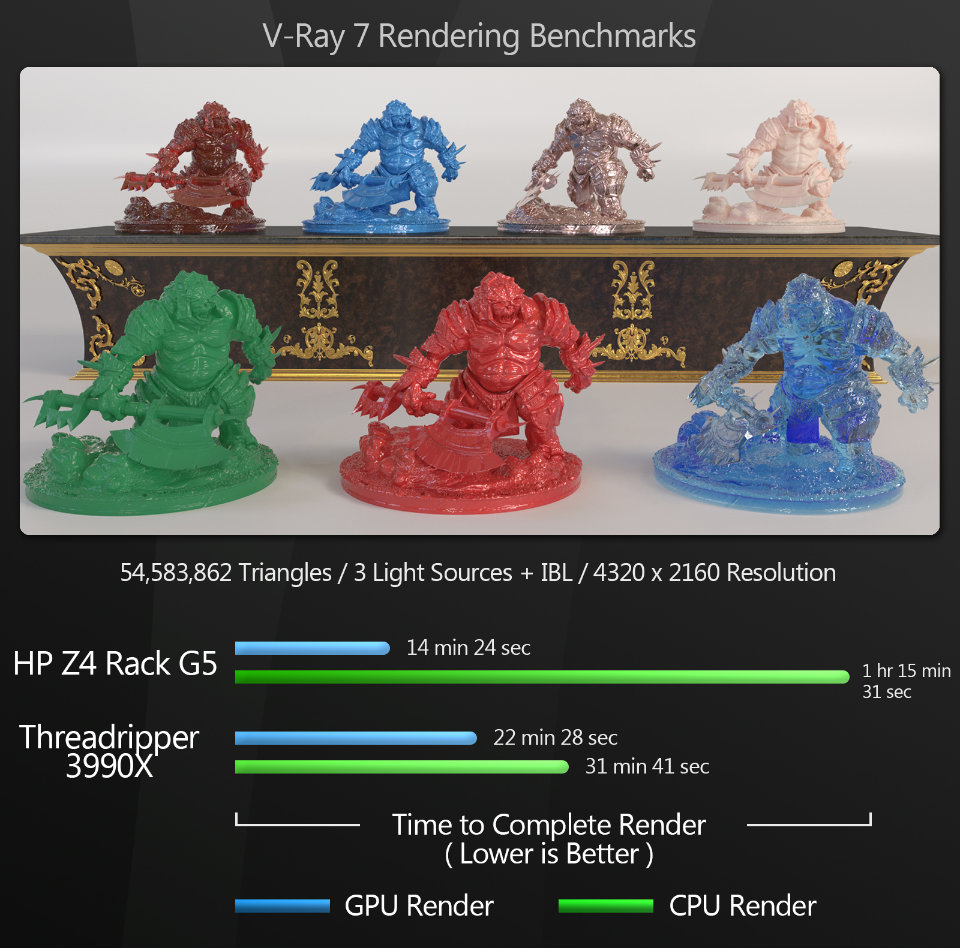Here, the results are perfectly divided. When rendering on the CPU, the Threadripper 3990X system wins out, thanks to its massive advantage in CPU core count; on the GPU, the Z4 Rack G5 wins out.
