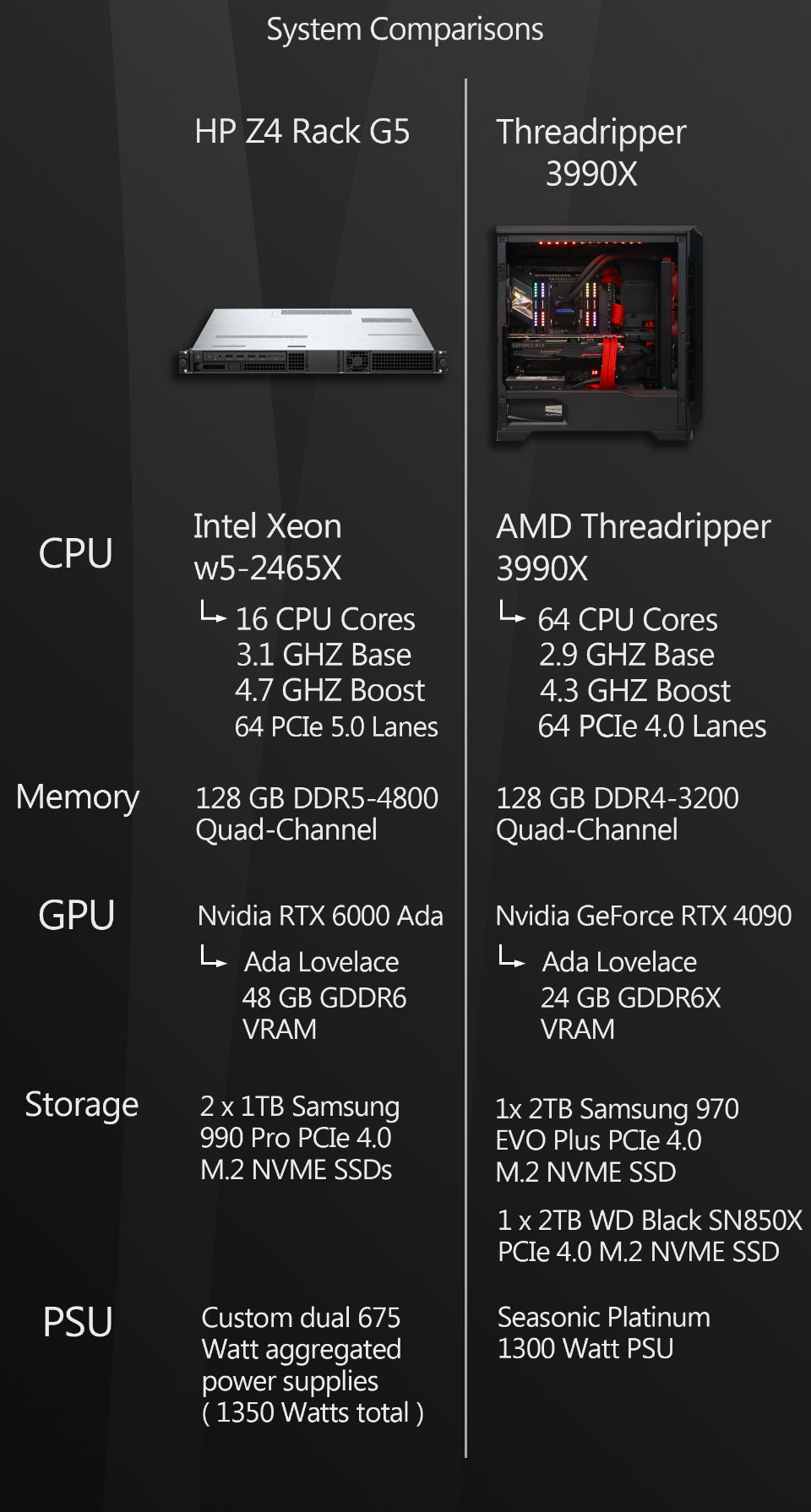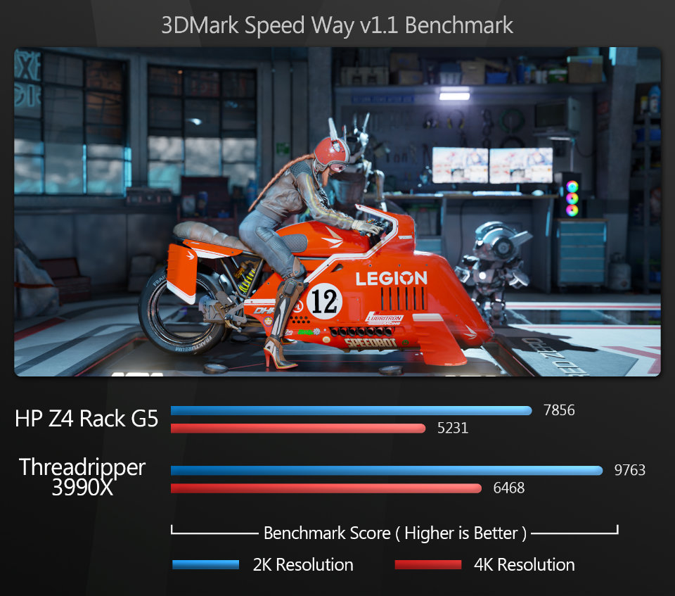 Since I don’t have another system that falls into a similar performance category to the Z4 Rack G5, as a point of comparison for this review, I also ran the benchmark tests on the trusty AMD Ryzen Threadripper 3990X system I have used for my recent GPU group tests.