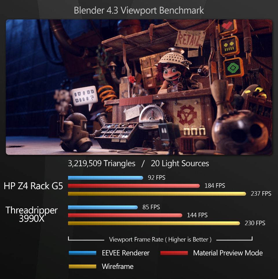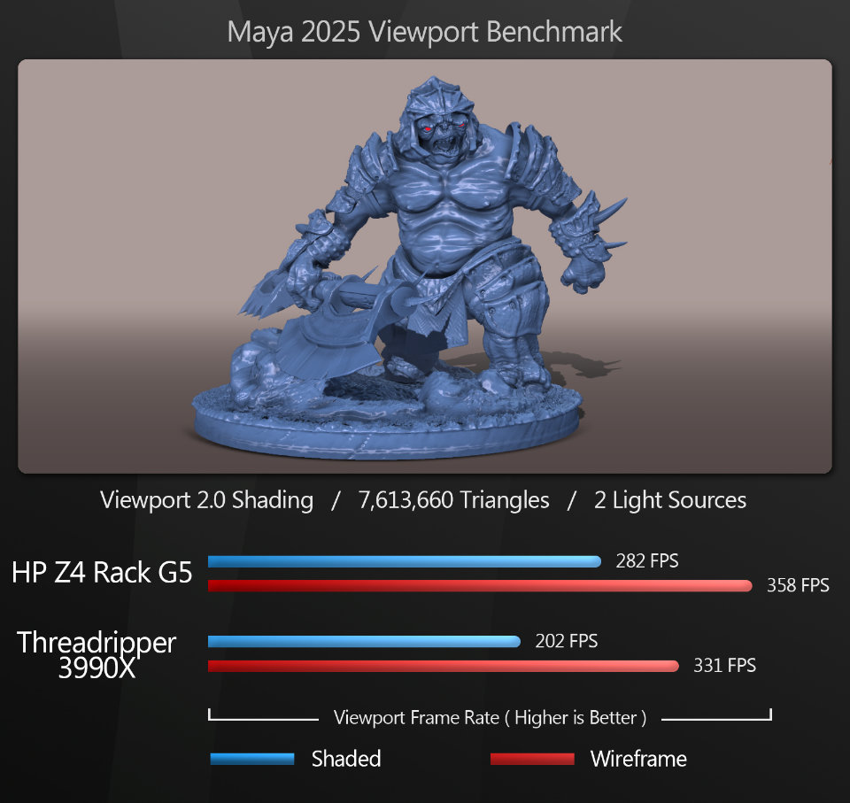 Instead, the CPU determines the result. The performance of DCC applications typically tops out at four to eight CPU cores, so the Threadripper system’s extra cores are of no benefit, and although both systems have similar clock speeds, the Z4 Rack G5’s Xeon CPU is much newer and has much better performance per core.