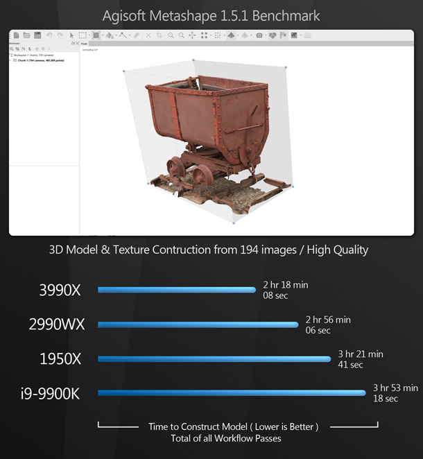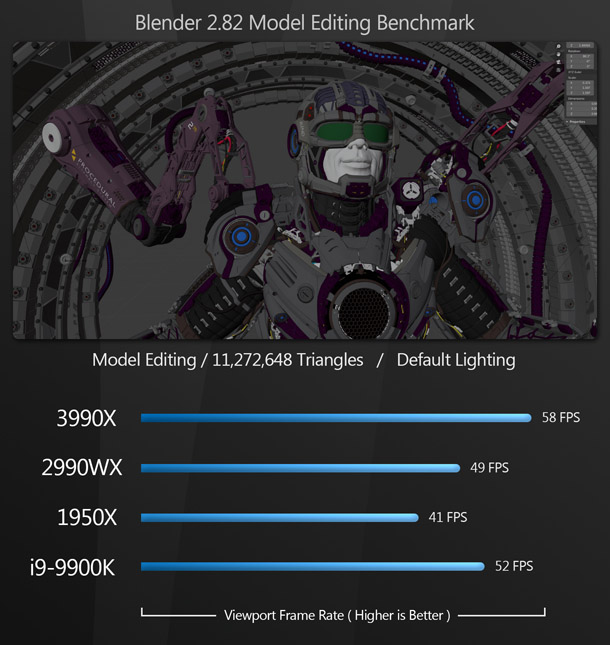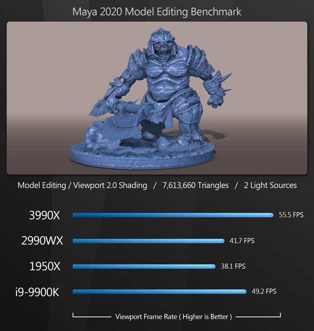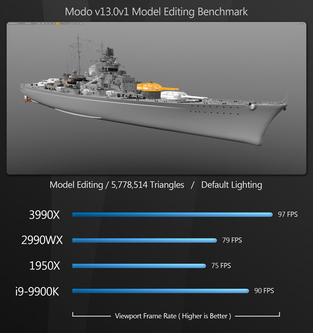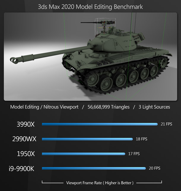 As you can see, model editing doesn’t need many CPU cores, but rather likes higher boost clock speeds. Although the Threadripper 3990X comes out on top, the much less expensive i9-9900K follows close behind. (It appears that these applications like the 3990X’s Zen 2 architecture, giving it the edge over the 9900K’s higher base and boost clock speeds.) The 2990WX comes in close behind the 9900K, and the 1950X takes the final spot. Although the order is consistent, all of the CPUs perform quite similarly.