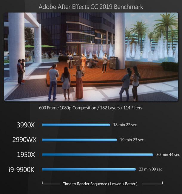 While it also does very well with lightly threaded applications, for this kind of work, the entire Threadripper series is overkill. If you’re just looking for a workstation to do 3D modelling and texturing, or Photoshop and After Effects work, a 64-core processor is far more than you need: there are much less costly CPUs that will do the job just as well, and in a few cases, probably a little better. But for tasks like lighting and look development, materials and shader authoring, simulation and tools development, the power to iterate quickly on a scene is extremely valuable, and in high-pressure productions, the 3990X would easily justify its cost.