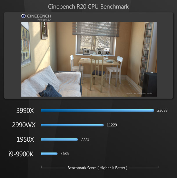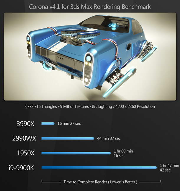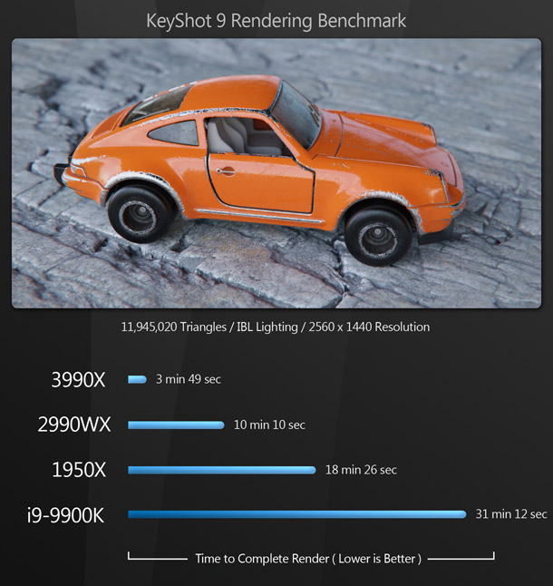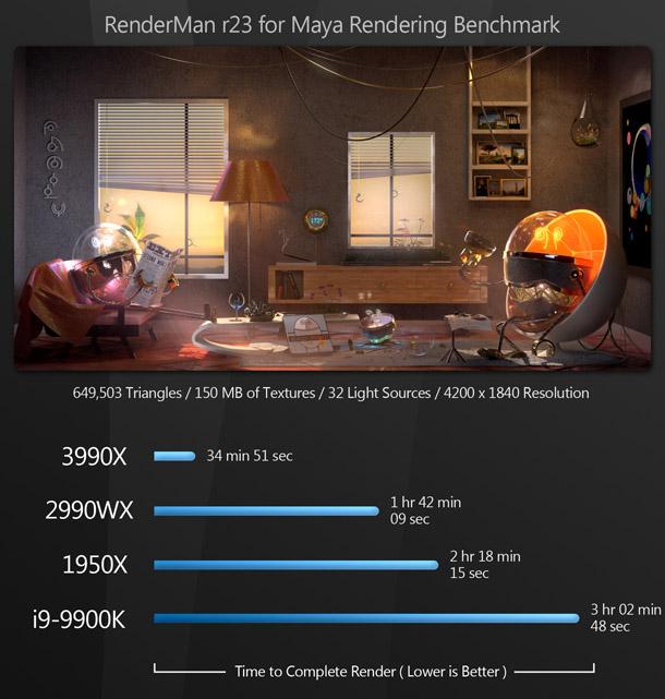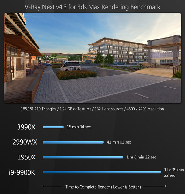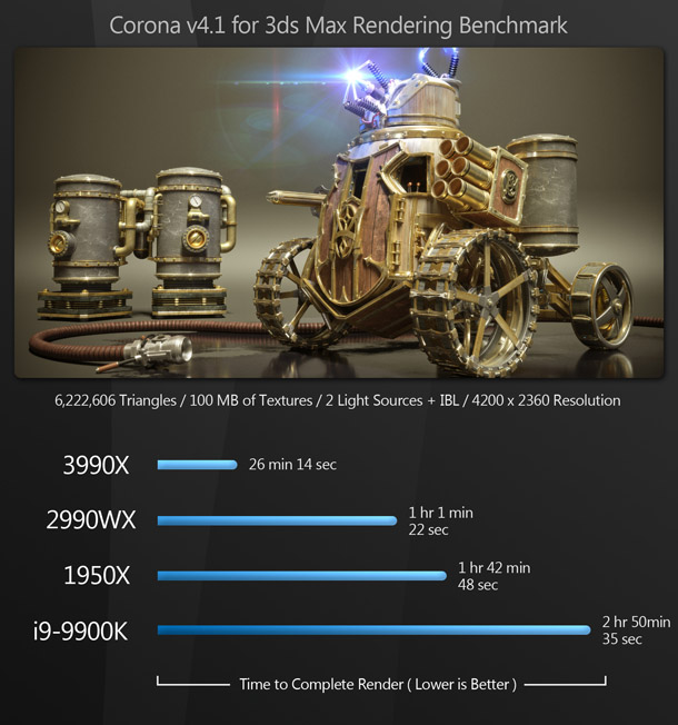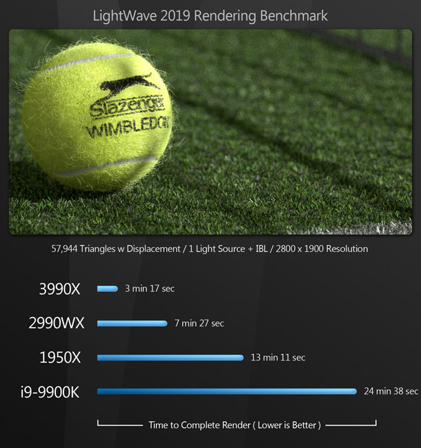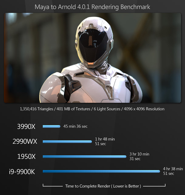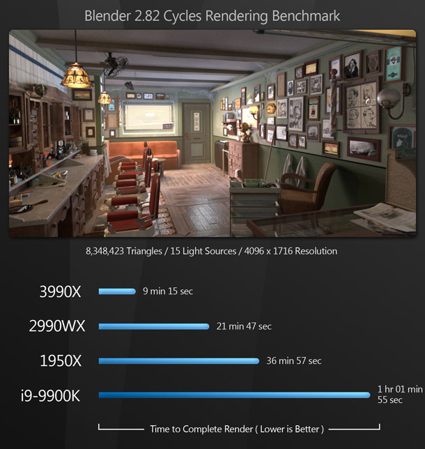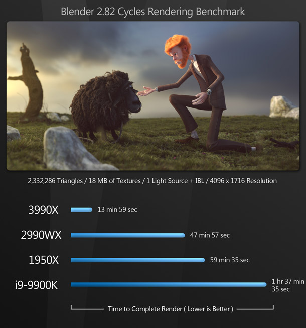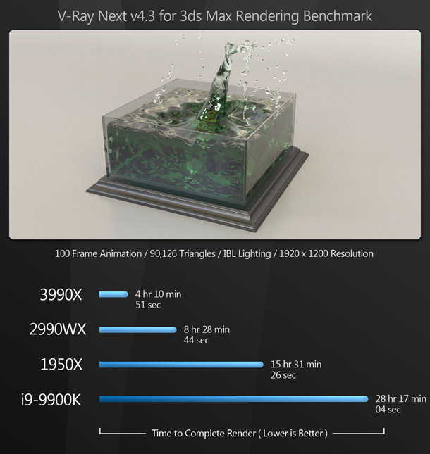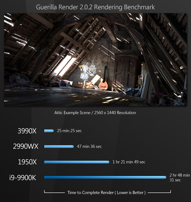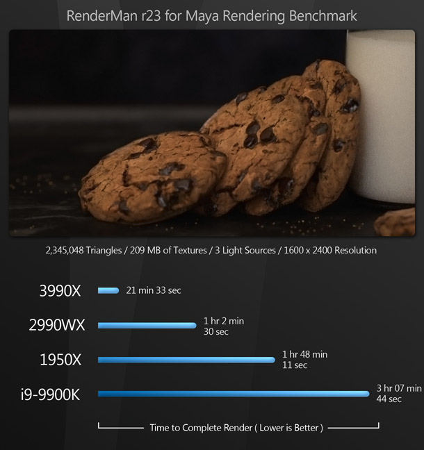 Overkill? A lot of people would say so. But for content creators, this is pure bliss: the same kind of bliss the world experienced when the first time someone figured out how to put peanut butter inside a chocolate cup. Most of the existing reviews of the Threadripper 3990X say that benchmarking the CPU is difficult, as few applications can make use of that many cores – and for the most part, they are right. But if you use DCC software, there are now many tools at your disposal that can harness this kind of CPU power.