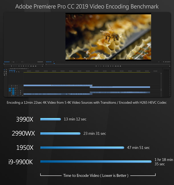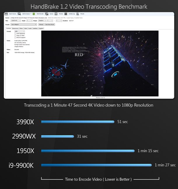 The Threadripper 3990X takes first place in all of these tests except one: for some reason, it doesn’t seem to play nicely with video encoding tool HandBrake. Unlike the rendering and simulation tests, in which the 3990X’s lead was consistently large, the margin of victory varies: large for Cinebench, Premiere Pro and World Machine, moderate with Metashape, and small with After Effects.