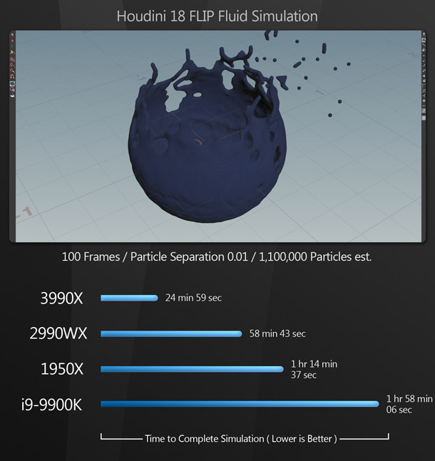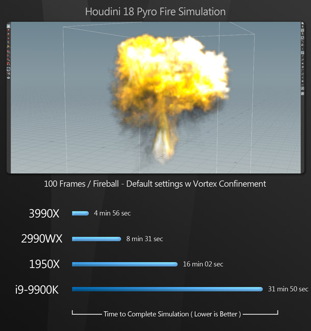 As with the rendering benchmarks, the 3990X takes top spot in all of the simulation tests by a large margin. (It’s also worth noting that both of the Houdini sims would have gone even faster had they not maxed out the 64GB of RAM in the Xidax system. Once the application had to page data out to disk, performance suffered greatly.) The huge performance gap between the 3990X and the 2990WX with RealFlow is interesting. I have a feeling that the 2990WX is underperforming here, as the 1950X isn’t too far behind in this test.