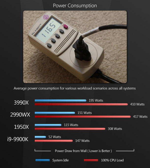 With the ever-increasing cost of electricity, power consumption has become an important metric to consider when buying new hardware. This is especially true when outfitting an entire studio. If you’re running multiple artists’ workstations as well as render and build farms, a difference of 100W of power draw per system can have a significant impact on your monthly electricity bill. So let’s see how our 3990X-equipped Xidax system stacks up. Power consumption was recorded with a P3 P4400 Kill A Watt meter.
