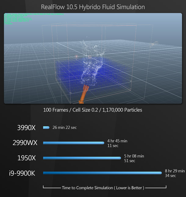 Next, we have some VFX simulation benchmarks, consisting of two liquid simulations and one fire simulation, using RealFlow’s Hybrido solver and Houdini’s FLIP solver for the liquid sims, and Houdini’s Pyro solver for the fire sim. Like renderers, simulation tools tend to be highly multi-threaded.