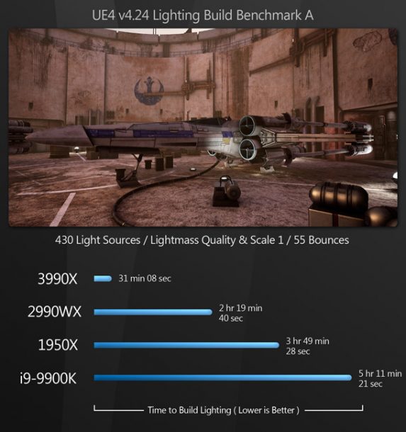 The last set of tests centre around real-time development with Unreal Engine 4. Since most people think of real-time performance being a function of the GPU, this may come as a surprise, but there are several CPU-driven tasks for which UE4 can make use of high core counts.