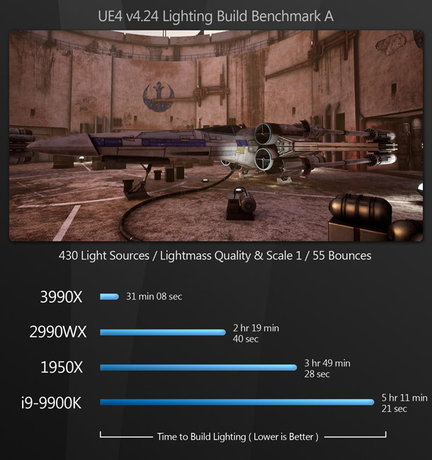 As with CPU rendering, the Threadripper 3990X handles lightmap baking extraordinarily well, coming in well ahead of the 2990WX, and leaving the 1950X and 9900K in the dust.