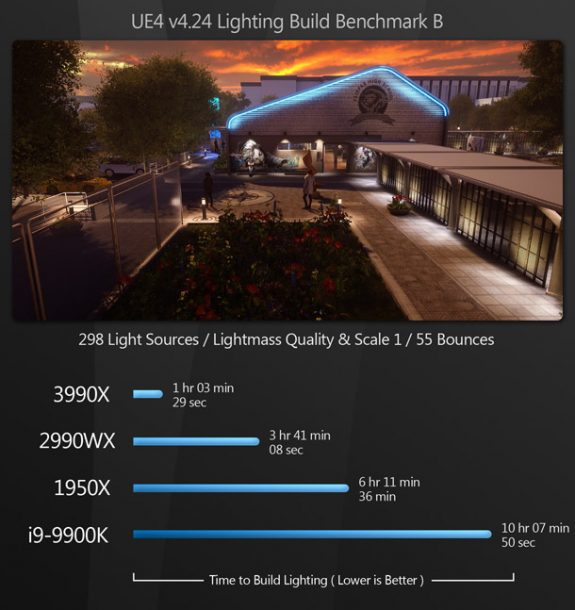 Again, the Threadripper 3990X takes a massive lead over the rest of the CPUs. Although I didn’t benchmark it here, another part of UE4 workflow in which high-core-count CPUs should offer performance gains is when loading a project for the first time, moving an existing project to a new version of Unreal Engine, or moving a project between computers, as in each case, the system has to re-cache the data and recompile the shaders.