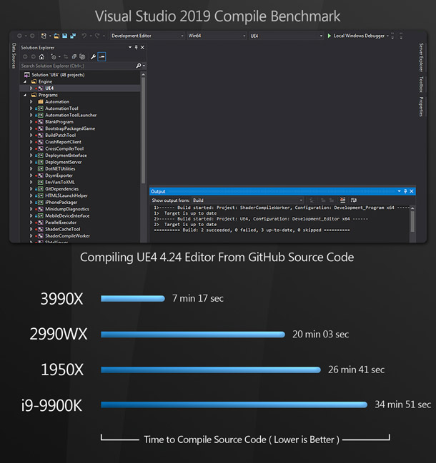 The final UE4-related benchmark uses Visual Studio 2019 to compile the Unreal editor from its source code.