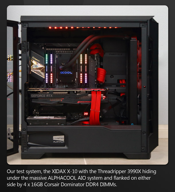 Our Threadripper 3990X came to us in a fully assembled workstation, courtesy of high-end system builder Xidax, one of AMD’s recommended suppliers for Threadripper-equipped desktop machines. The game development studio I work for has a small farm of Xidax systems, used for a variety of build and compute duties, so I was pleased when our main test machine turned out to be a Xidax system.