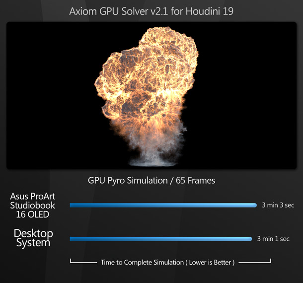 The additional benchmarks follow a similar pattern to the viewport and rendering tests, with the Studiobook 16 running neck-and-neck with the desktop system on the GPU-based Axiom solver, but the desktop system taking the lead in the other benchmarks, where the CPU comes into play.