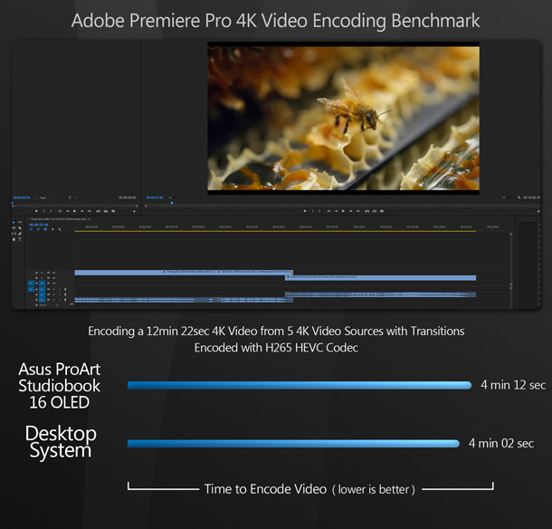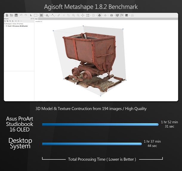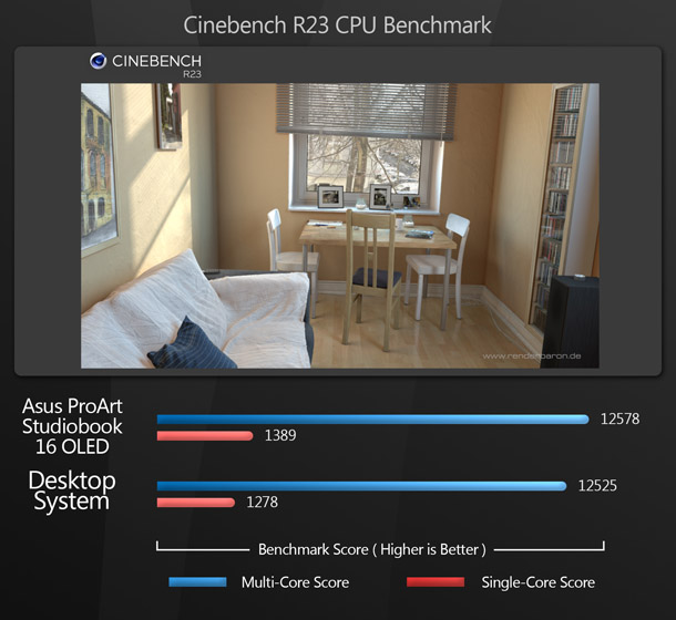 Let’s look at performance first. For the most part, the Asus ProArt Studiobook 16 OLED keeps up with a Dell desktop system with similar specifications. The desktop system comes out top in most of the benchmarks, but by a relatively small margin, and with the exception of a few CPU-heavy tests, you would hardly notice the difference in day-to-day work.