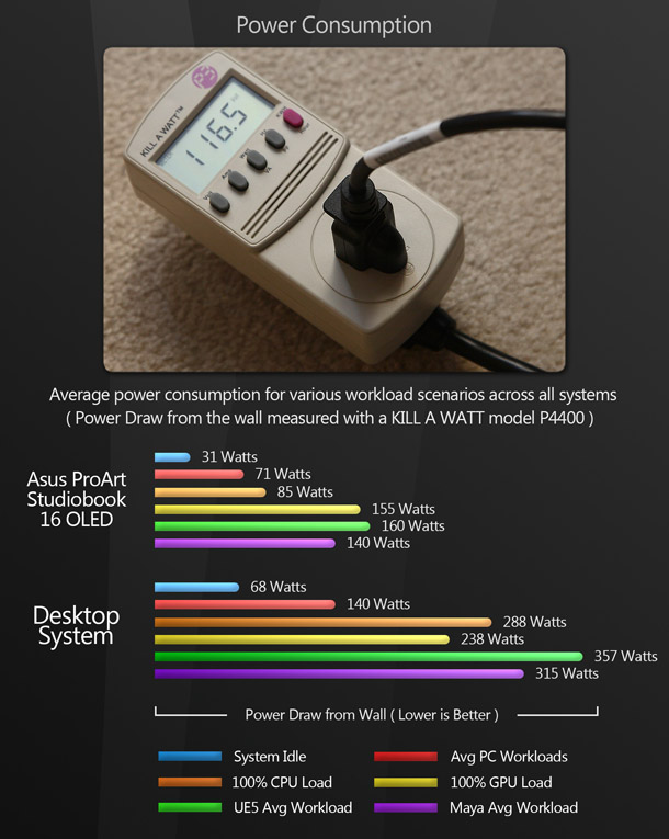 Given how similar the performance of the two systems is, you might expect them to use a similar amount of energy. In fact, the Studiobook 16 uses significantly less power than the desktop system: in some cases, less than half. This would explain why it doesn’t get uncomfortably hot under normal use. A few spots around the keyboard get quite warm with extended use, but I have used mobile systems that run much hotter.