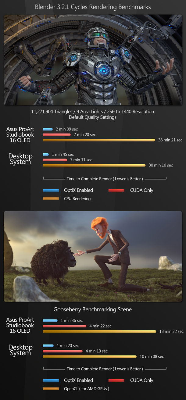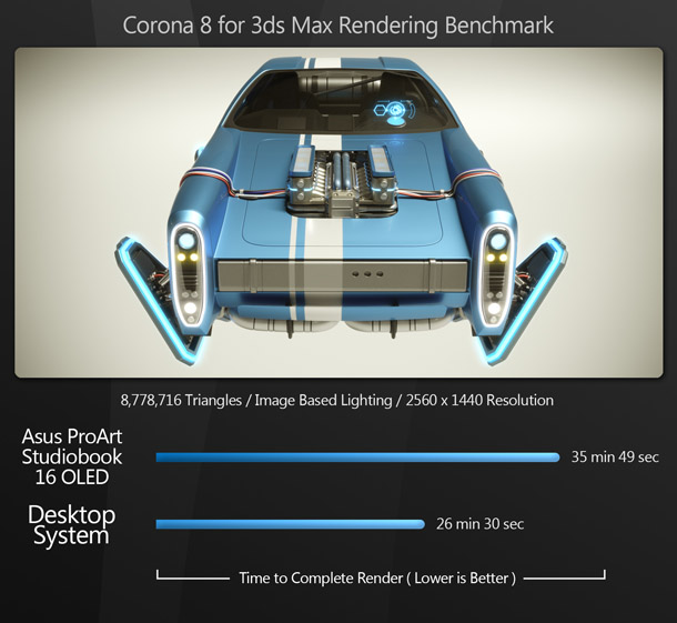 The rendering benchmarks yield similar results to the viewport display tests, providing the GPU is being used for rendering. For the two CPU rendering benchmarks – Blender’s Cycles renderer and Corona – the performance gap increases, with the two extra CPU cores of the desktop system’s Core i9-10900K providing additional rendering horsepower compared to the Studiobook’s Ryzen 9 5900HX.