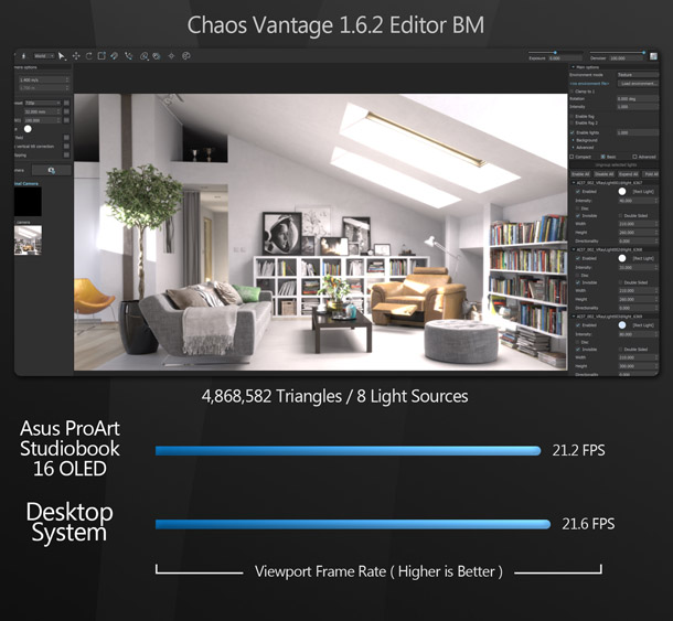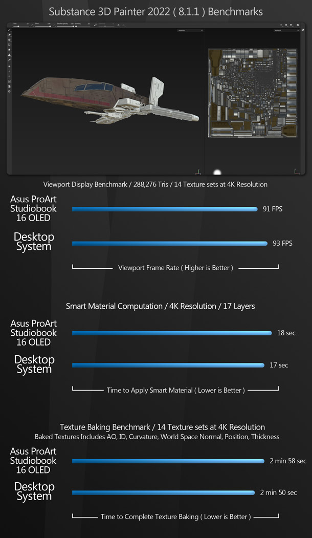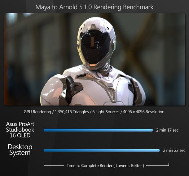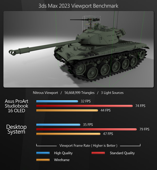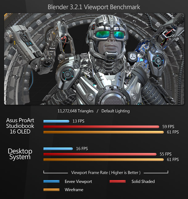 In the viewport benchmarks, the frame rate scores represent the figures attained when manipulating the 3D assets shown, averaged over five testing sessions to eliminate inconsistencies. Testing was performed at 60Hz at the native resolution of the Studiobook 16’s OLED display (3,840 x 2,400px), and on desktop, on a 32-inch 4K display running at its native resolution of 3,840 x 2,160px.