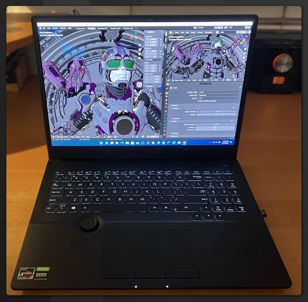 The Asus ProArt Studiobook 16 OLED we are looking at here isn’t Asus’s top-of-the-range mobile system, but it’s still pretty powerful, sporting an eight-core AMD Ryzen 9 5900HX CPU running at 3.3 GHz (with a maximum boost speed of 4.6 GHz), and a Nvidia GeForce RTX 3070 mobile GPU in addition to the Radeon Vega GPU on the 5900HX die. For memory, the Studiobook 16 is equipped with 32GB of 3,200MHz DDR4 RAM in a 2 x 16GB configuration, and for storage, 2 x 1TB PCIe 4.0 M.2 SSD drives in a RAID 0 configuration.