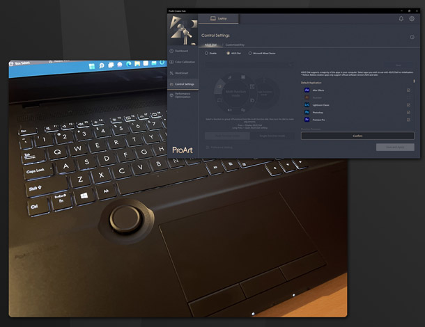 Flipping up the screen reveals a pretty standard back-lit mobile-format keyboard with thin, short-throw keys, a generously sized trackpad, and the Asus Dial, a mechanical wheel that controls various functions in DCC applications. It can be mapped to custom shortcuts through Asus’s ProArt Creator Hub app.