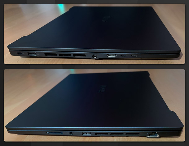 Connectivity is decent: not the best I have seen in a mobile system, but not the worst either, with two full size USB 3.2 Gen2 Type-A ports, two USB 3.2 Gen2 Type-C ports, a HDMI 2.1 port, a RJ45 Ethernet port, a 3.5mm audio jack, a SD Express 7.0 card reader and the DC power input. These compete for space along the sides of the system with a pair of rather large cooling exhaust vents.