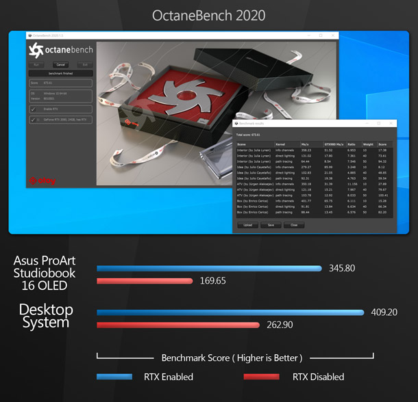 Our synthetic tests yield some interesting results. 3DMark and OctaneBench perform roughly as expected, with the desktop system taking the lead over the Studiobook, albeit not by much.