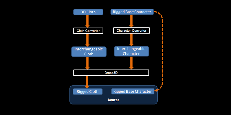 A third tool, Dress3D, converts the interchangeable assets into a dressed 3D character that can be exported to other DCC software.