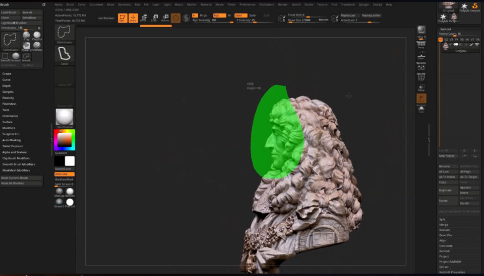 Since Michael initially only needed to prepare Prince Rupert’s face for animation, he sliced the face away from the base model in ZBrush before transferring it to Character Creator.