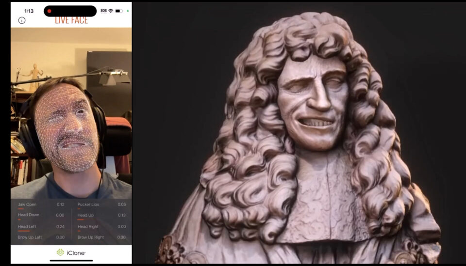 The Live Face app enabled Michael to capture facial motion data on his iPhone and livestream it to iClone on his workstation, bringing the statue of Prince Rupert to life in real time.