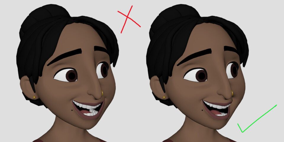 Although they were producing 2D drawings on paper, traditional animators created mouth shapes with an appealing sense of three-dimensionality. Paradoxically, when posing characters in 3D software, we often lose this dimensionality, as we don’t get the feeling that the lips are wrapped correctly around the teeth. This is especially true when posing characters in three-quarter views.