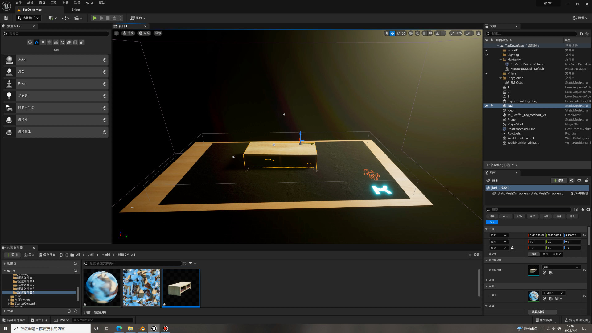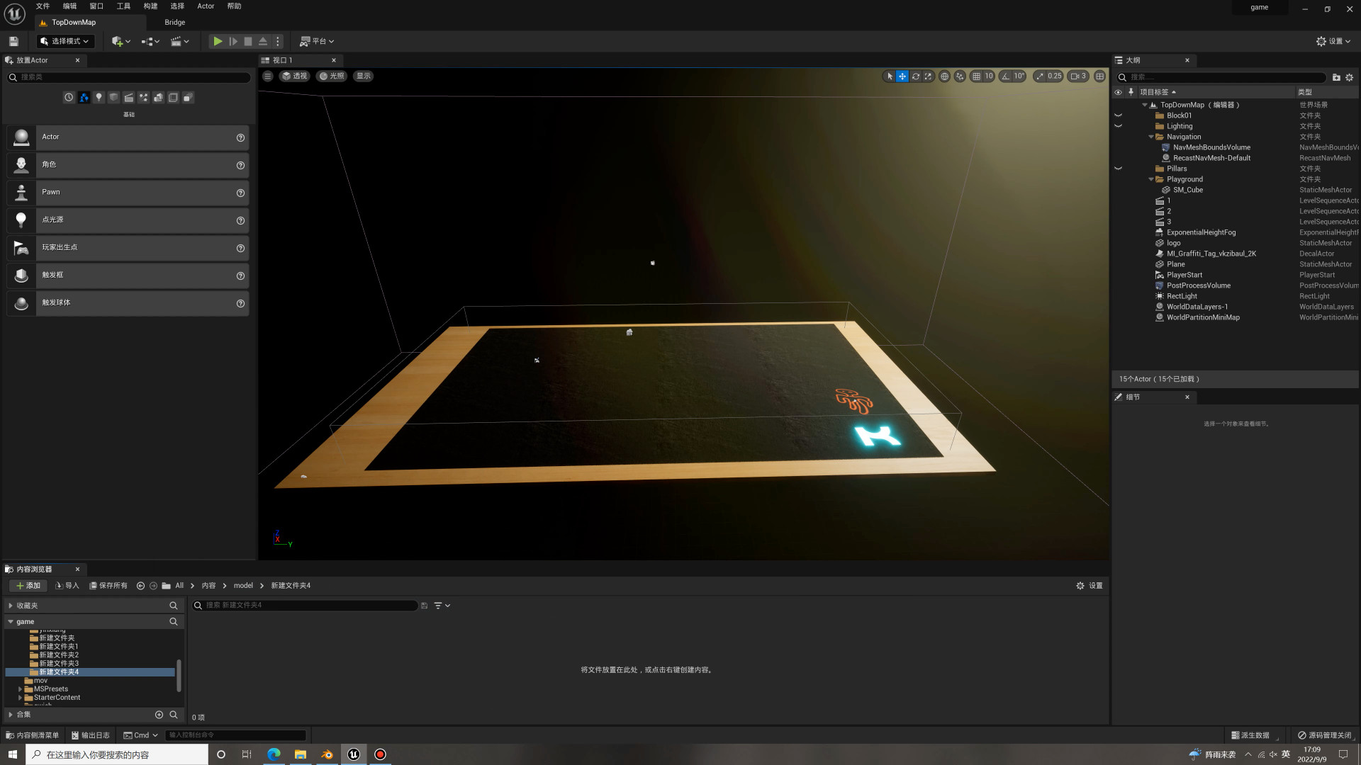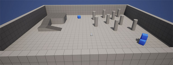 Now, time to plan the game. The mission I wanted is simple: navigate through and past obstacles to find the treasure (in this case, the little blue cube). So I created a small, simple playground inside Unreal Engine and dropped in a few obstacles to get the hang of it and see how it looked.